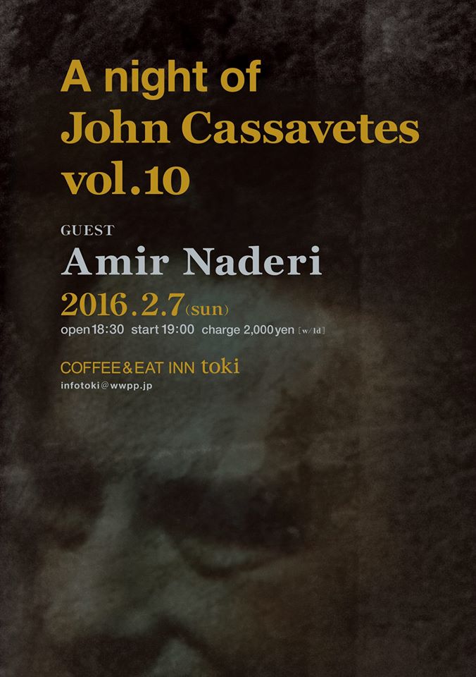 A night of John Cassavetes 1 ~ 10 ゲスト 松田広子(映画プロデューサー『教誨師』『岸辺の旅』)篠崎 誠(映画監督『あれから』)樋口泰人(映画評論家・爆音上映主宰)諏訪敦彦(映画監督『風の電話』『ライオンは今夜死ぬ』)大友良英(音楽家)大城真(音楽家)渡邊琢磨(音楽家)越川道夫(映画監督『海辺の生と死』『月子』 加瀬亮(俳優)西島秀俊(俳優)渡辺真起子(俳優)ギャスパー・クラウス(音楽家)岩松 了(俳優)アミール ナデリ (映画監督『monte』『cut』)鈴木 卓爾(脚本家、俳優、映画監督『嵐電』)